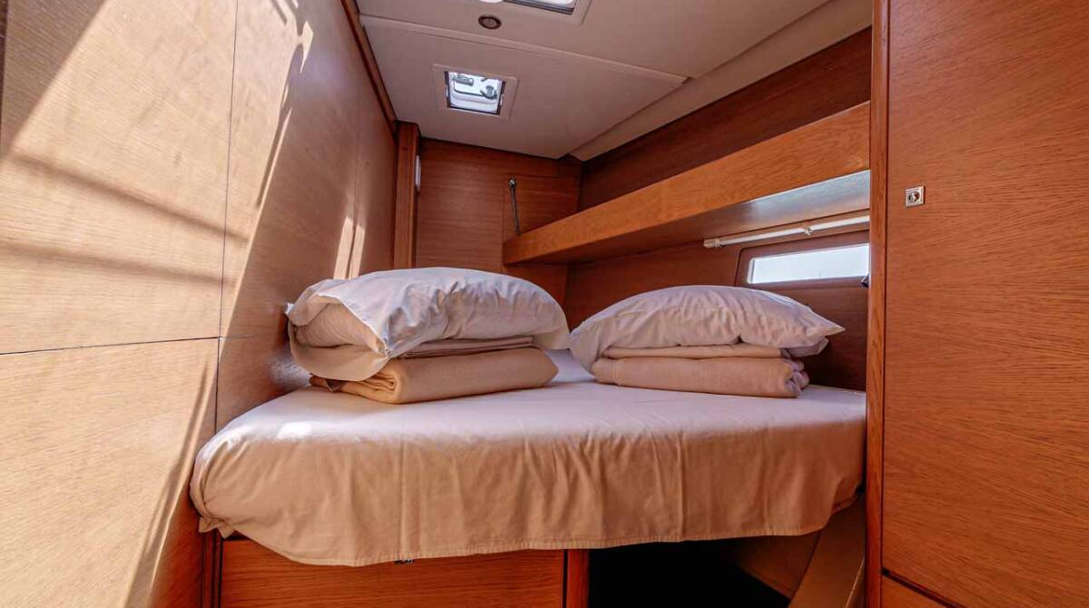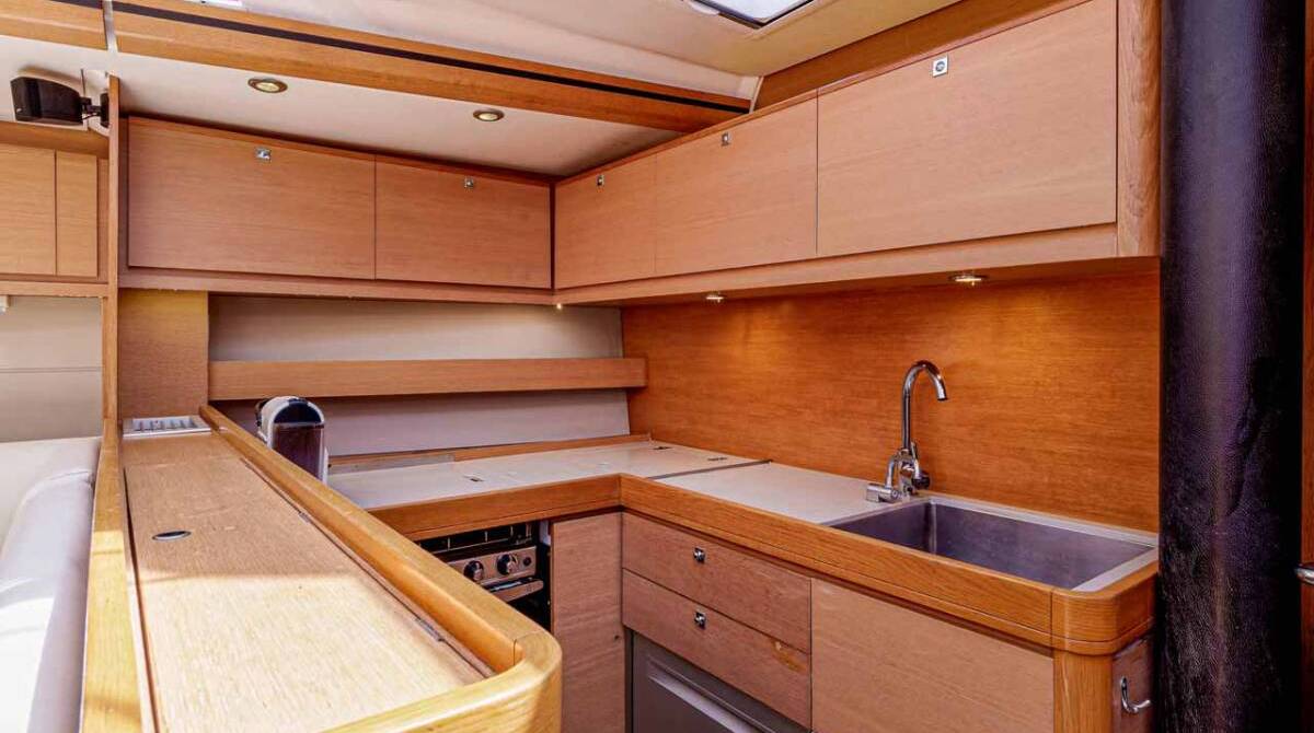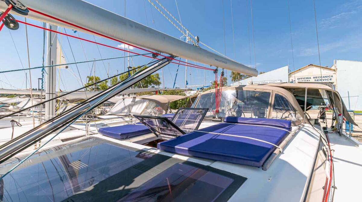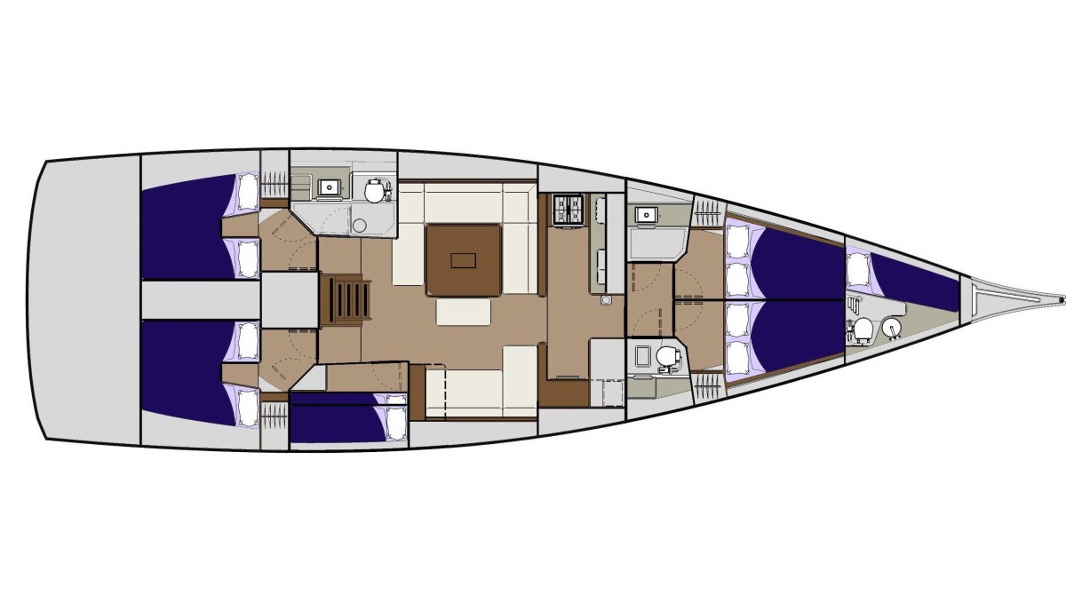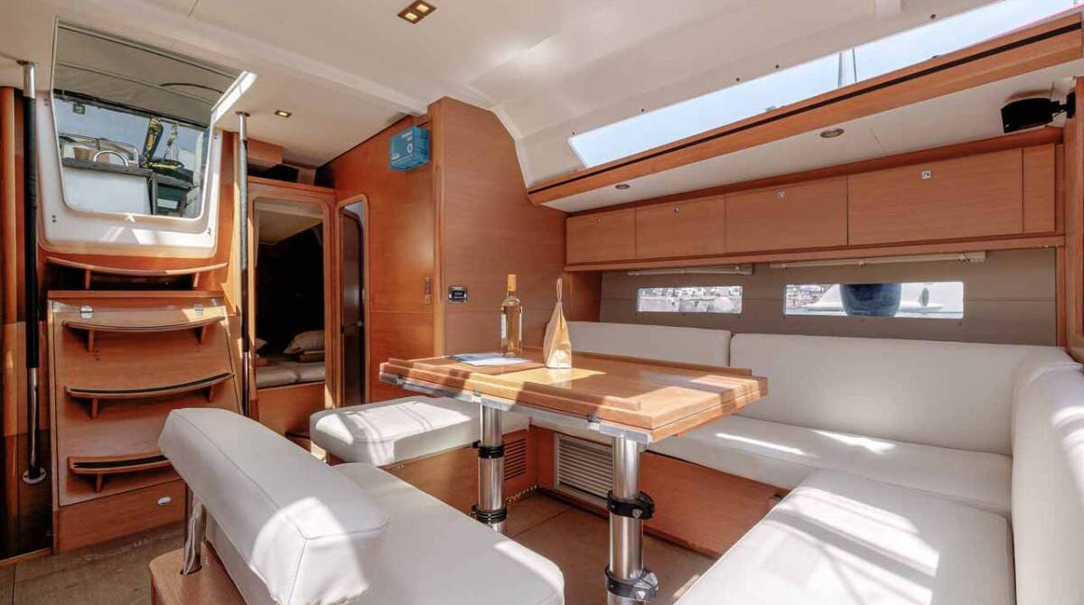 The Dufour 560 Grand Large has a very balanced hull shape, with powerful aft sections and a reduced wetted surface, and efficient appendices. The high ballast ratio and greater stability form of the hull allows the boat to support a powerful sail plan without sacrificing cruising comfort and safety. The sail plan has been designed to ensure maximum performance with minimum effort. Hence the choice of the fixed bowsprit, the self-tacking jib and the boom inclined forward, all designed for this purpose.