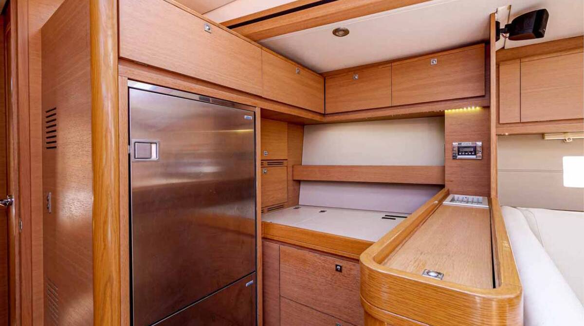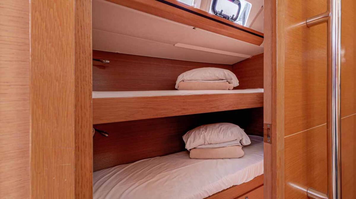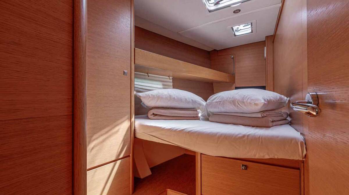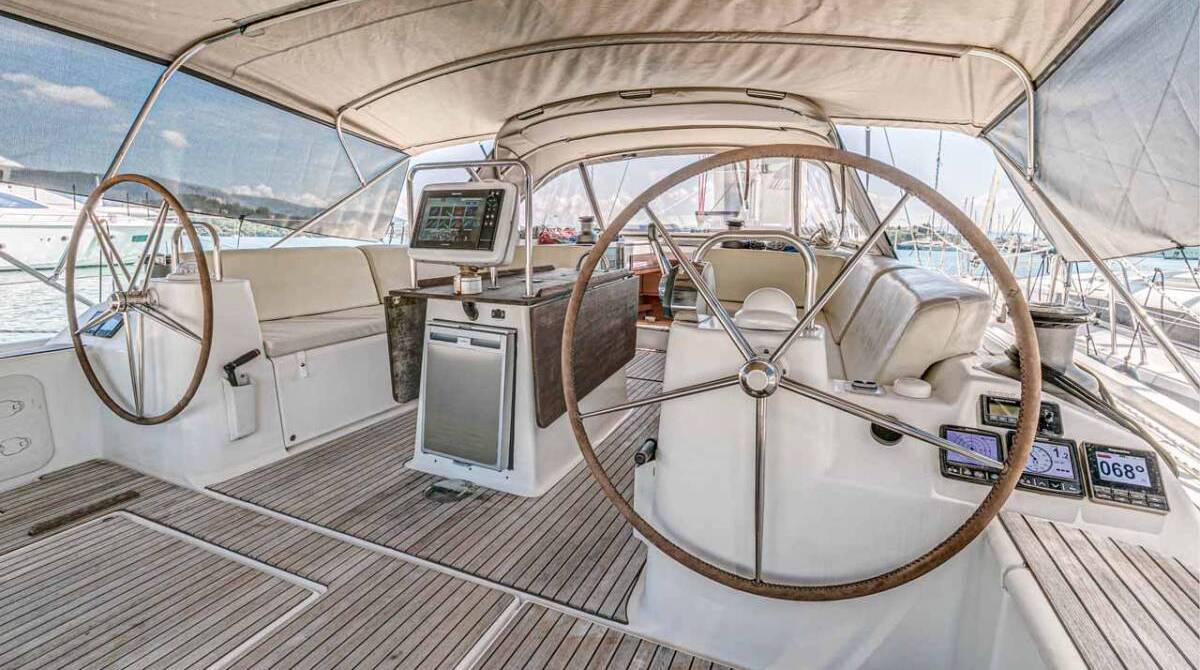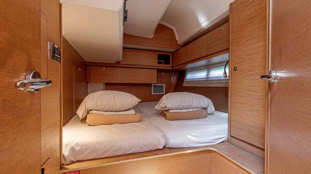 The Dufour 560 Grand Large has a very balanced hull shape, with powerful aft sections and a reduced wetted surface, and efficient appendices. The high ballast ratio and greater stability form of the hull allows the boat to support a powerful sail plan without sacrificing cruising comfort and safety. The sail plan has been designed to ensure maximum performance with minimum effort. Hence the choice of the fixed bowsprit, the self-tacking jib and the boom inclined forward, all designed for this purpose.